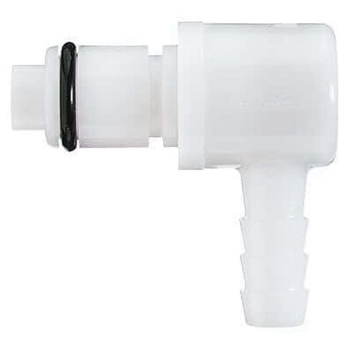 CPC Straight-Through Non-Valved Elbow Coupling Insert, Connection Type 1: Quick Disconnect, Connection Size 1: 1/4 in, Connection Type 2: Hose Barb, Connection Size 2: 1/4 in, 120 psi, Polypropylene, Almond, Dimensions: 1.35 in L, 32 - 160 deg F