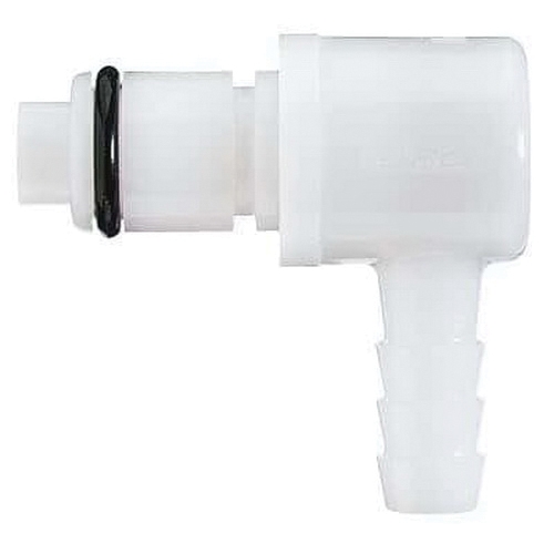CPC Valved Elbow Insert, Connection Type 1: Quick Disconnect, Connection Size 1: 1/8 in, Connection Type 2: Hose Barb, Connection Size 2: 1/8 in, 120 psi, Acetal, Finish: Natural, White, Dimensions: 1.09 in L, -40 to 180 deg F