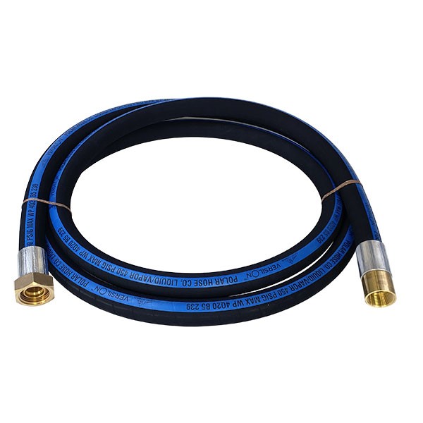 Saint-Gobain Polar® CO² Assembly, Inside Diameter: 1 in, Connection 1: 1.5" FNPT, Connection 1 Material: Brass, Connection 2: 1" CGA, Connection 2 Material: Brass, Hose Length: 15 ft, Hose Application: Bulk CO² Transfer Tube Material: Smooth-Bore, Low-Temp EPDM , Cover Material: EPDM , Construction: Braided Stainless Steel , Pressure Rating: 450 psi, Method of Attachment: Aluminum Crimp Ferrule , Temperature Low: -65 °F, Temperature High: 212 °F