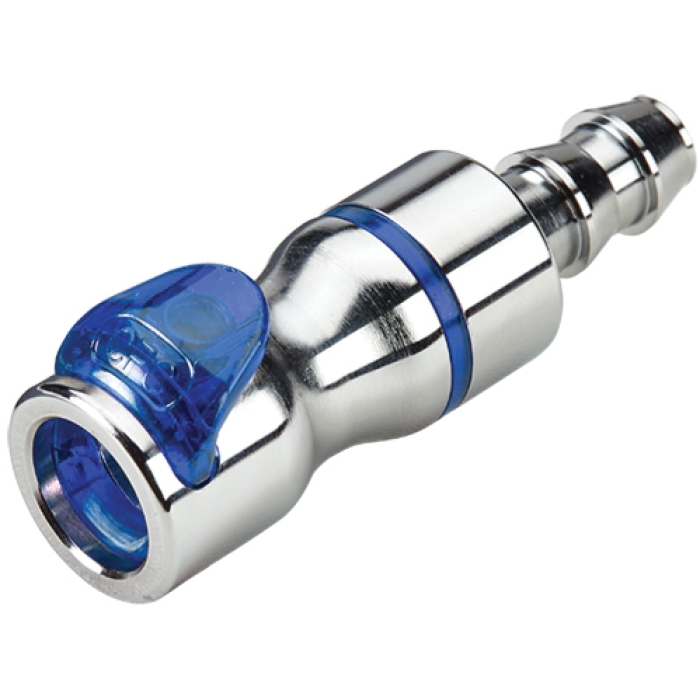 CPC® Valved Coupling Body, LQ4 Series, 1/4 x 3/8 in Connection, Quick Disconnect x Lock-On Hose Barb, Material Construction: Brass, Chrome-Plated, Metallic/Cool Blue, 0.98 in Dia x 2.69 in L, 120 psi Maximum Operating Pressure, 0 to 240 deg F Operating Temperature, 3 gpm Flow Rate, 1.4 Cv Flow Coefficient, In-Line Mount, EPDM Seal, Stainless Steel Valve Spring