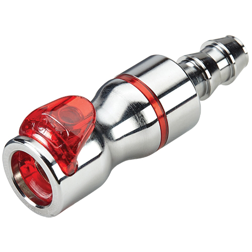 CPC® Valved Coupling Body, LQ4 Series, 1/4 x 3/8 in Connection, Quick Disconnect x Lock-On Hose Barb, Material Construction: Brass, Chrome-Plated, Metallic/Warm Red, 0.98 in Dia x 2.69 in L, 120 psi Maximum Operating Pressure, 0 to 240 deg F Operating Temperature, 3 gpm Flow Rate, 1.4 Cv Flow Coefficient, In-Line Mount, EPDM Seal, Stainless Steel Valve Spring