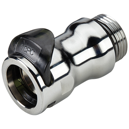 CPC® Valved Coupling Body, LQ8 Series, 1/2 x 3/4 in Connection, Quick Disconnect x SAE Threaded, Material Construction: Brass, Chrome-Plated, 1-1/4 in Hex, 1.58 in Dia x 2.58 in L, 120 psi Maximum Operating Pressure, 0 to 240 deg F Operating Temperature, 6 Cv Flow Coefficient, In-Line Mount, EPDM Seal, Stainless Steel Valve Spring