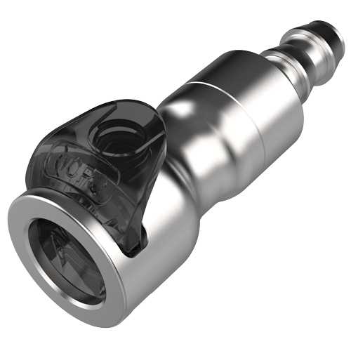 CPC® Valved Coupling Body, UQD04 Series, 1/4 x 3/8 in Connection, Quick Disconnect x Hose Barbed, Material Construction: 303 Stainless Steel, Passivated, Metallic/Black, 1.18 in Dia x 2.81 in L, 120 psi Maximum Operating Pressure, 36 to 167 deg F Operating Temperature, 1.3 Cv Flow Coefficient, In-Line Mount, EPDM Seal, Stainless Steel Valve Spring
