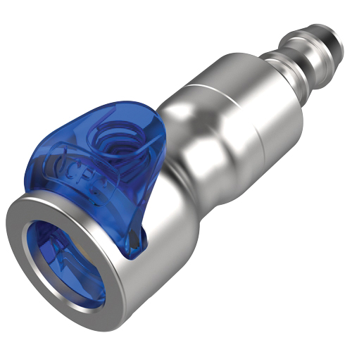 CPC® Valved Coupling Body, UQD04 Series, 1/4 x 3/8 in Connection, Quick Disconnect x Hose Barbed, Material Construction: 303 Stainless Steel, Passivated, Metallic/Blue, 1.18 in Dia x 2.81 in L, 120 psi Maximum Operating Pressure, 36 to 167 deg F Operating Temperature, 1.3 Cv Flow Coefficient, In-Line Mount, EPDM Seal, Stainless Steel Valve Spring