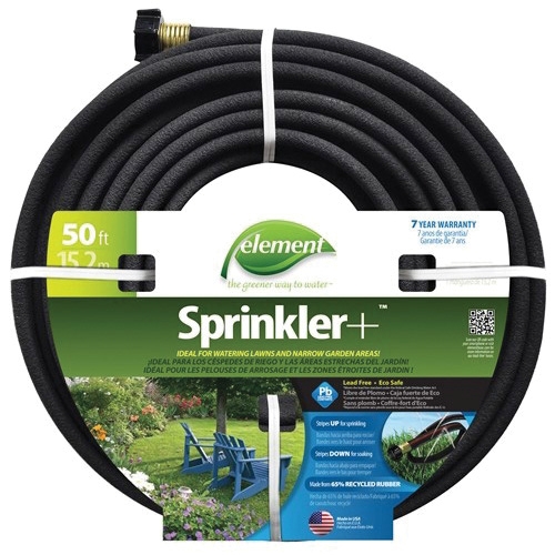 Need a sprinkler hose and a soaker hose for your watering needs leave it to the innovation experts at Swan to combine the two. Our Element-brand Sprinkler+® hose features six holes per foot for a uniform watering pattern. Simply place the stripe of holes up for a sprinkler that sprays a wall of mist, or place the stripe down for a traditional soaker hose. Now you can water your lawn, vegetable garden, flowerbeds or any narrow or small space with just one garden hose. The sprinkler hose is a snap to unroll into place and then roll and store when done. A cap for the male end of the water hose also makes for easy storage as well as draining. And because it's an element hose, it meets the lead-free standards under the Federal Safe Drinking Water Act, so no harmful chemicals or odors are added to your water supply.