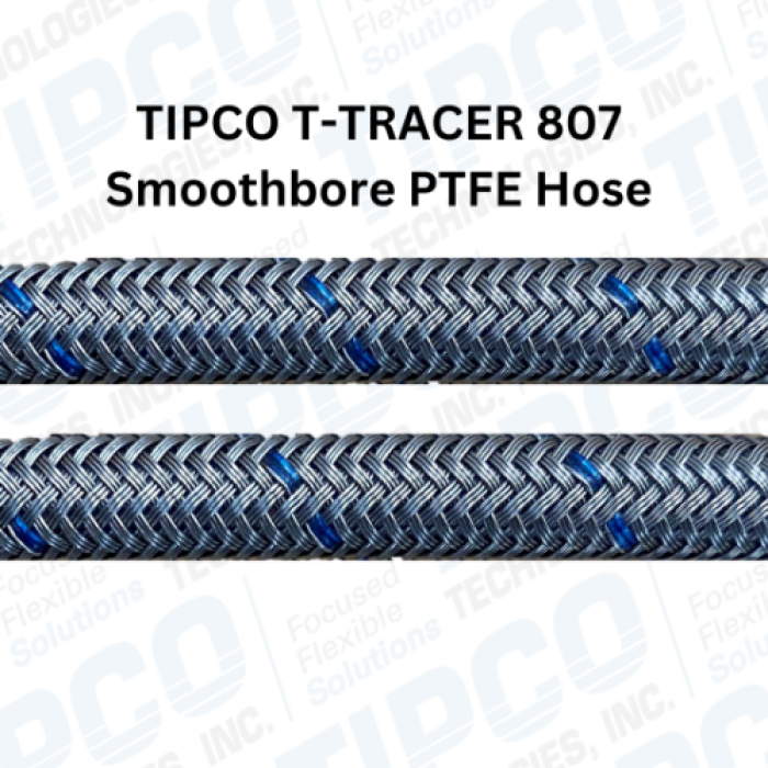T-TRACER 807 PTFE hose is an excellent choice in applications requiring steam cleaning or transfer of highly viscous media such as, adhesives, paints or food products. The 304 stainless steel wire reinforcement provides the strength necessary to carry the working pressure and the durability to withstand harsh environments. High temperature hydraulic and pneumatic systems, like those found in steel mills, foundries, transit buses and air compressors are ideal applications for TIPCO T-TRACER 807.