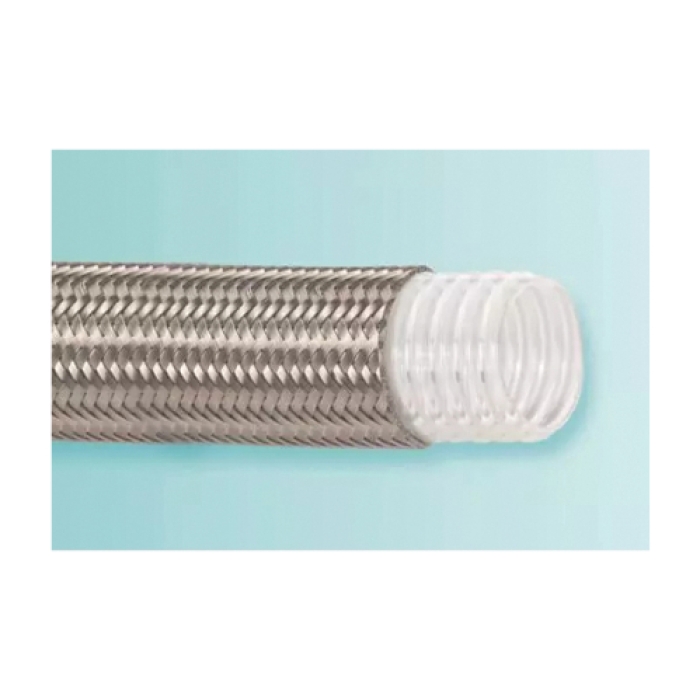Versilon™ Convoluted Transfer Hose, 1/2 in Nominal, 1/2 in Inside Diameter, 3/4 in Outside Diameter, 125 ft Length, Fluoropolymer Tube, 304 Stainless Steel Reinforcement, White Hose, 1-3/4 in Bend Radius, 1750 psi, Resistance Properties: Chemical, Temperature High: 450 deg F, Temperature Low: -65 deg F, Crimp End Connection