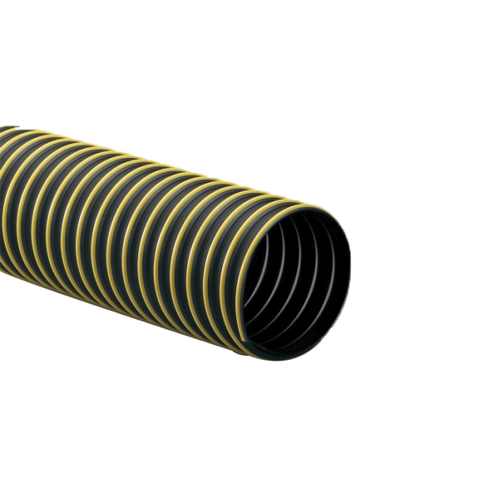 Flexaust® Flexadux® TR Mediumweight Ducting Hose, T-7W Series, Nominal Size: 5 in, 5 in ID, 0.03 in Thick Wall, 8 psi, Thermoplastic Rubber, Construction: Mediumweight Thermoplastic Rubber Hose Reinforced with a Spring Steel Wire Helix and External Polypropylene Wearstrip, Black/Yellow, 5-1/2 in Bend Radius, Resistance Properties: Abrasion, Chemical, Drag, Moisture, UV, -60 deg F Low, 275 deg F High