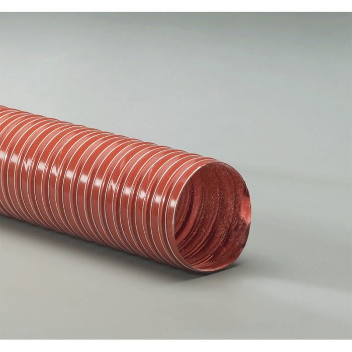 2-ply iron oxide red silicone-coated fiberglass fabric hose reinforced with a spring steel wire helix and external filament fiberglass cord.