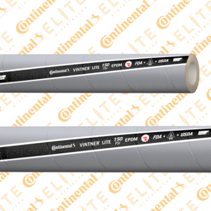 Continental Vintner™ Lite 150 EPDM Liquid Transfer Hose 21129808, 1-1/2 in, 150 psi, Inside Diameter: 1 1/2 in, : Bending Radius , 6 in : , Temperature Range: -30°F / -34°C ~ 220°F / 104°C, Hose Application: Liquid Transfer Hose , Function: Liquid flow, Tube Material: EPDM Rubber Meets FDA, USDA & 3-A Sanitary Standard 18-03 Certificate #3727 Standard 18-03), Cover Material: EPDM Rubber Wrapped Finish, Reinforcement: Spiral-plied fabrics with monofilament, Pressure Rating: 150 psi, Color: Gray/Red