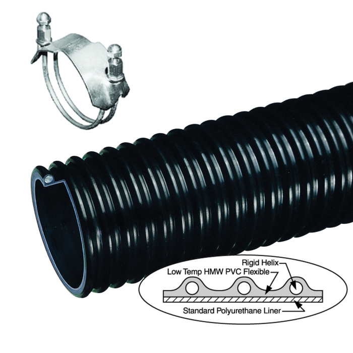 Kuriyama Tigerflex® Heavy-Duty Material Handling Hose, Series: Ureflex™ UF1™, Nominal Size: 5 in, 5-3/4 in OD, 5 in ID, 50 ft Length, 40 psi, Polyurethane, PVC Cover, Construction: Rigid PVC Helix, Black, 10 in Bend Radius, Resistance Properties: Abrasion, Oil, -40 deg F Low, 150 deg F High