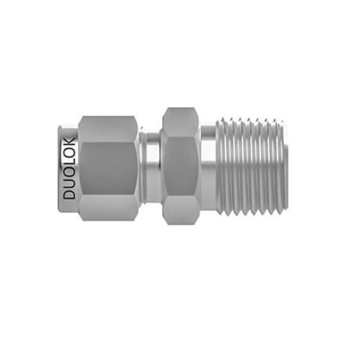 SSP® Duolok® Bore Through Straight Connector, MCBT Series, Connection Type 1: Tube Fitting, Connection Size 1: 1/8 in, Connection Type 2: NPT, Gender 2: Male, Connection Size 2: 1/16 in, Hex Size: 7/16 in, 316 Stainless Steel, Dimensions: 1.17 in L
