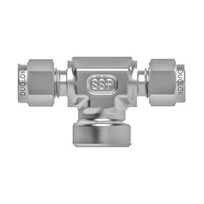 SSP® Duolok® Branch Tee, FBT Series, Connection Type 1: Tube Fitting, Connection Size 1: 1 in, Connection Type 2: Tube Fitting, Connection Size 2: 1 in, Connection Type 3: NPT, Gender 3: Female, Connection Size 3: 1 in, Thread Size 3: 1-11-1/2, Hex Size: 1-1/2 in, 316 Stainless Steel, Dimensions: 4.22 in L