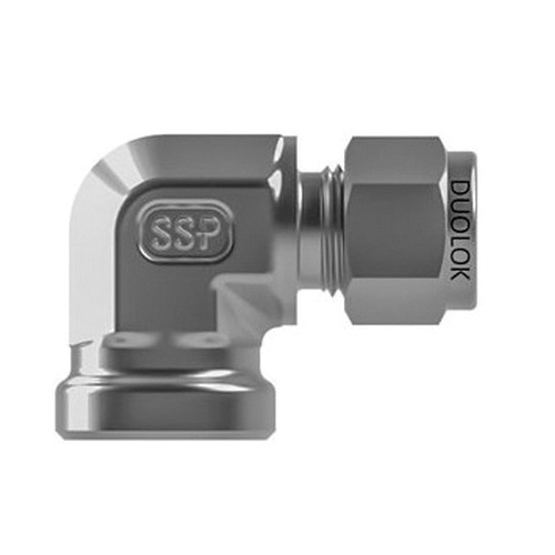 SSP® Duolok® 90 deg Elbow, FE Series, Connection Type 1: Tube Fitting, Connection Size 1: 1/8 in, Connection Type 2: NPT, Gender 2: Female, Connection Size 2: 1/4 in, Hex Size: 7/16 in, 316 Stainless Steel