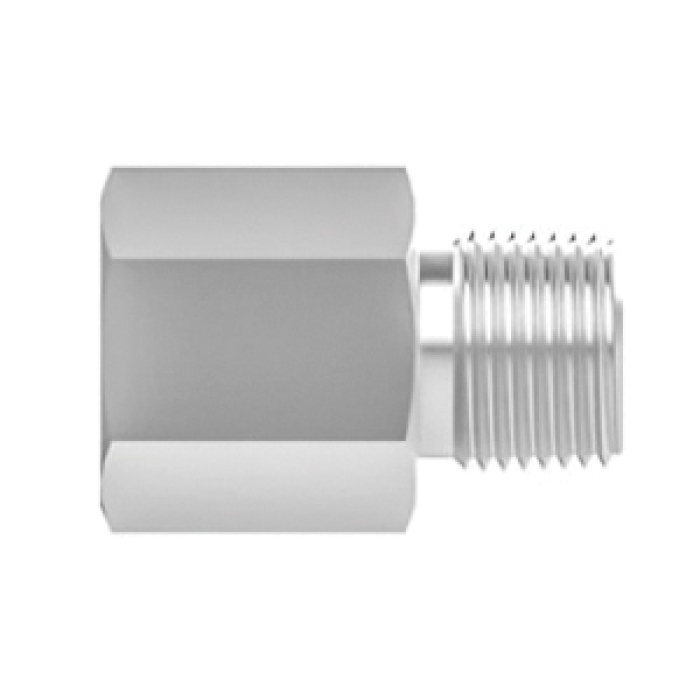 SSP® TruFit10K® Pipe Reducing Adapter, Connection Type 1: NPT, Gender 1: Female, Connection Size 1: 1/4 in, Thread Size 1: 1/4-18, Connection Type 2: NPT, Gender 2: Male, Connection Size 2: 1/8 in, Thread Size 2: 1/8-27, Hex Size: 3/4 in, 316 Stainless Steel, Dimensions: 1.21 in L