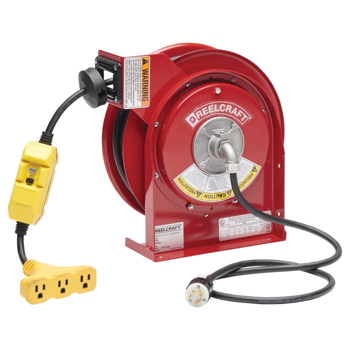 Reelcraft® Series L 4000 and L 5000 power and light cord reels offer many different styles of outlets and lamps. Easy-to-mount and structurally strong, the power cord and light cord reels have robotically welded heavy-gauge steel frame that attaches to most structurally sound surfaces. For indoor, non-weather tight applications only.