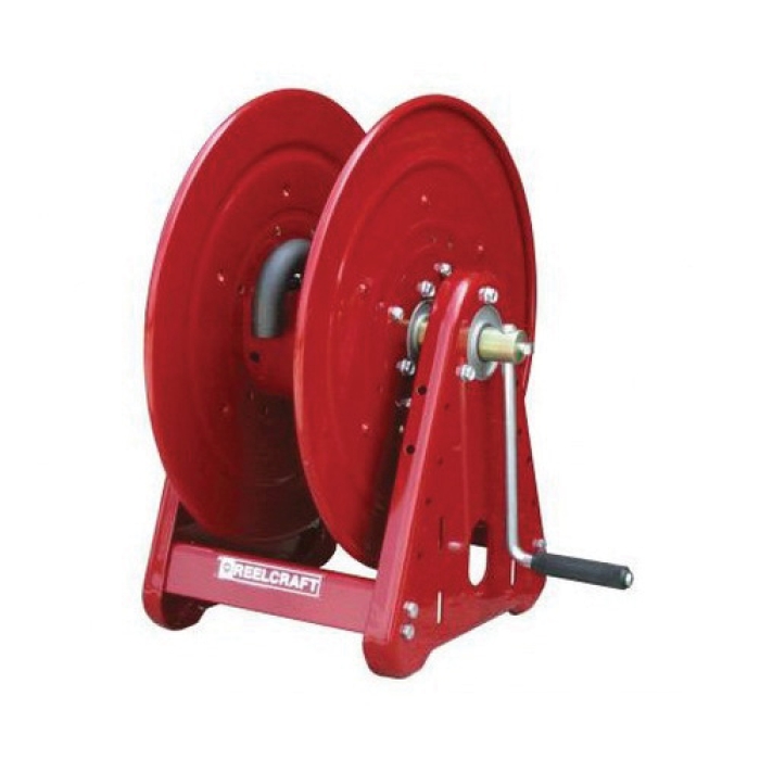 Reelcraft® Heavy-Duty Hand Crank Hose Reel, 30000 Series, 100 ft Length Hose, 1/2 in Hose Inside Diameter, 0.85 in Hose Outside Diameter, Inlet Size: 1/2 in FPT, Outlet Size: 1/2 in FPT, Locking Style: Self-Locking, Steel, Finish: Powder-Coated, Red, Bench, Floor, Truck, Wall Mount, 210 deg F, 3000 psi, Dimensions: 19-3/4 in L x 17-3/4 in W x 20-1/4 in H
