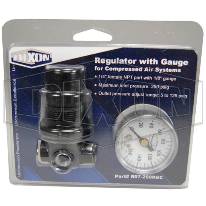 Dixon® Carded Miniature Regulator, R07 Series, Inlet Pipe Size: 1/4 in, Flow Rating: 15 scfm, 5 - 100 psi, 150 deg F, Includes: GC620 Gauge, Packaging Quantity: 1 PK