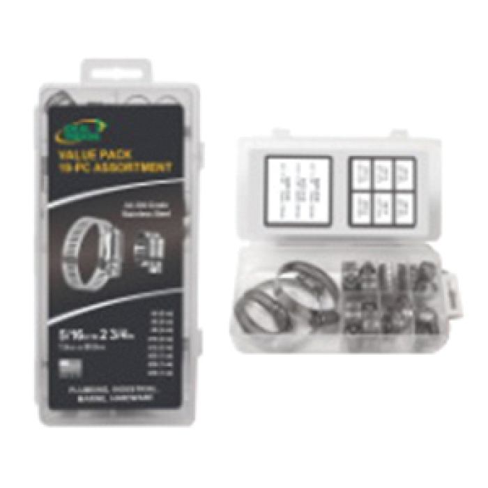 Ideal Tridon® Hose Clamp Assortment Kit, 300 Stainless Steel, Includes: (6) 5/16 to 5/8 in Size 4 Clamp, (4) 5/16 to 7/8 in Size 6 Clamp, (2) 7/16 to 1 in Size 8 Clamp, (2) 1/2 to 1-1/16 in Size 10 Clamp, (2) 1/2 to 1-1/4 in Size 12 Clamp, (1) 3/4 to 1-3/4 in Size 20 Clamp, (1) 1-1/4 to 2-1/4 in Size 28 Clamp, (1) 3/4 to 2-3/4 in Size 36 Clamp and Handy Reusable Plastic Case, Packaging Quantity: 19 PK