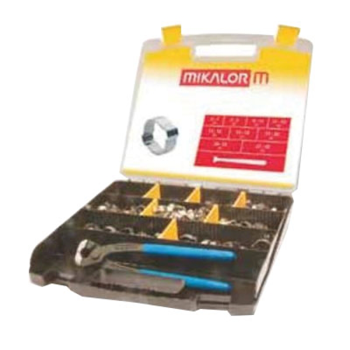 The different diameters of clip are arranged in individual compartments, making it easy to find the appropriate size. The sturdy plastic case is also very convenient for transporting the product. All Mikalor assortment boxes include the appropriate tool for assembling the clip in question. In the case of the worm-drive assortments, each case contains a flexible hex-socket screwdriver which can be used to tighten Mikalor worm-drive clips in all sorts of application zones. The two-ear clip assortment boxes contain a pair of side-closing ear clip pincers.