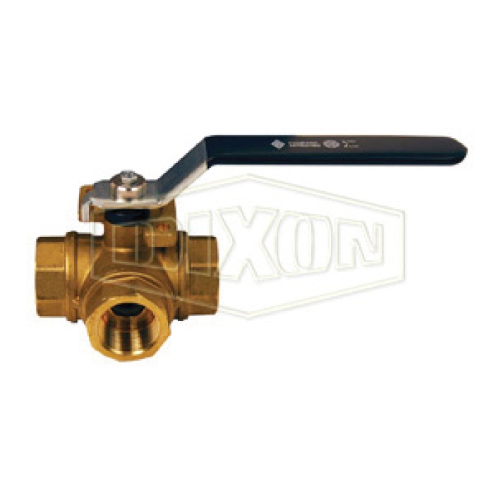 Dixon® 3-Way Diverting Standard-Port Ball Valve, Nominal Size: 1-1/2 in, Connection Type: FPT, Actuator Type: 1/4-Turn Handle, Brass, PTFE Trim, PTFE Seal, 4.86 in Length, 366 deg F, 400 psi