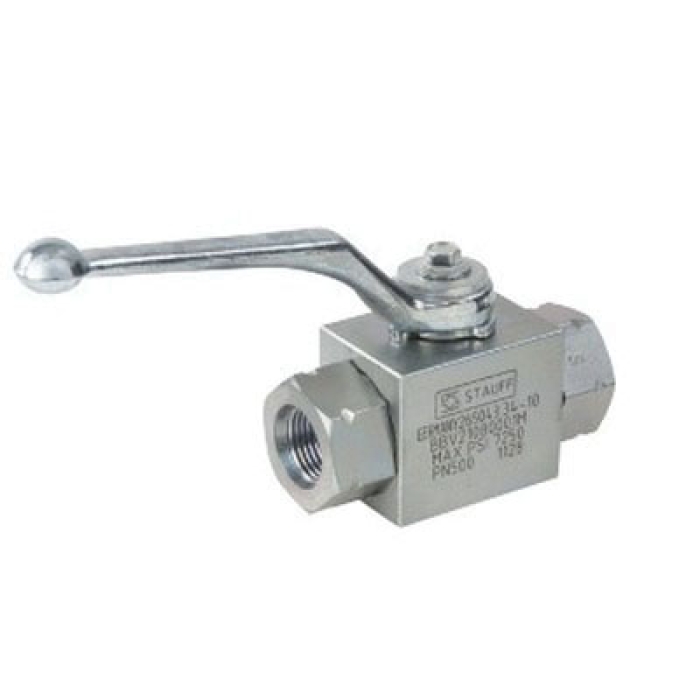 Stauff® 2-Way High-Pressure Block Body Ball Valve, BBV-2 Series, Nominal Size: 1/4 in, Connection Type: FPT, Actuator Type: Lever, Carbon Steel, Carbon Steel Ball and Stem, Delrin(POM) Seat Trim, FKM Seal, Finish: Zinc/Iron-Plated, 2.7 in Length, 1.84 in Height, -4 to 212 deg F, 7250 psi